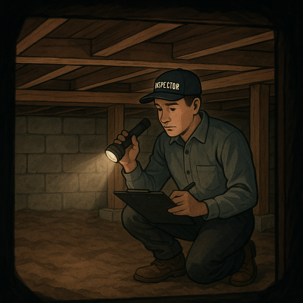 What happened: A licensed inspector reviewed the exterior foundation, garage, deck posts, and interior access points, then entered the crawl space. They found: