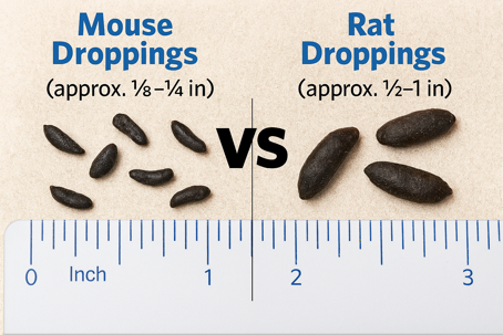 Start with any droppings or gnawing you can find. Mouse droppings are typically about ⅛–¼ inch long and pointed; rat droppings are larger (roof rat ≈ ½ inch, Norway rat ≈ ¾–1 inch). That size difference, paired with where you find them (low, near burrows vs. high, near rooflines), is often enough to point you in the right direction (Cornell CALS). Cornell CALS